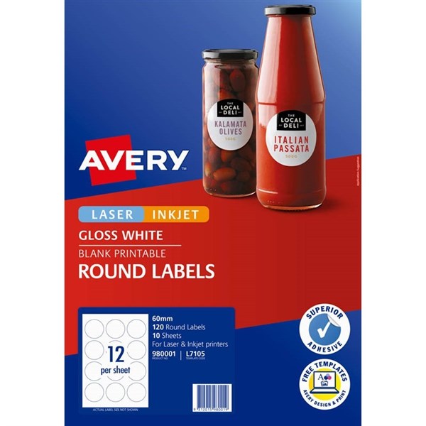 AVERY 980001 L7105 BLANK PRINTABLE LABELS ROUND LASER/INKJET 12UP GLOSSY WHITE PACK 10